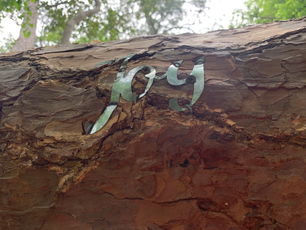 Walking in the other direction, you see them — three foil letters meticulously screwed into the arch of the tree at least 7 feet off the ground. The letters spell “joy” in a glimmering olive-colored cursive. It’s almost but not quite camouflaged by the bark.